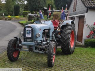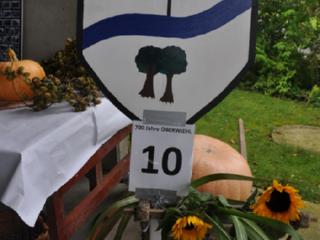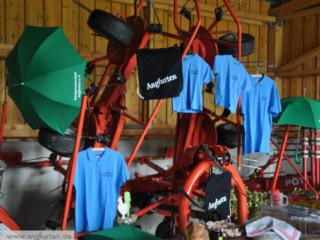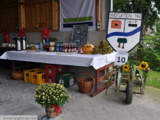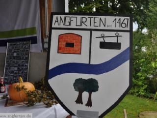 Durch die Ortsmitte zurück ging es an einer unserer vielen Sitzecken in und um Angfurten herum mit Patenbank und Kinderwarnpüppchen vorbei zurück zum Geflügelhof und zum gemütliches Beisammensein mit vielen Gesprächen, Blick in unsere Chronik, auf die Homepage von Angfurten und aktuelle Bilder vom Oberwiehler Festumzug, und die Deko in der Halle, mit unseren Shirts, Schirmen, Taschen, Bechern, unserer Steentalerwährung und vielem mehr.